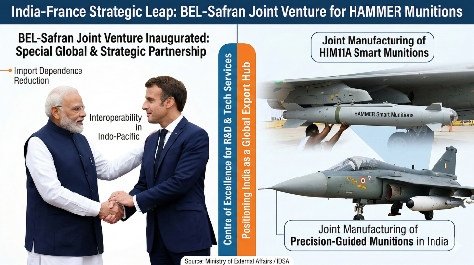 Overview: Elevating their relationship to a ‘Special Global and Strategic Partnership’, India and France inaugurated the BEL-Safran Joint Venture during President Macron’s recent visit. Aimed at manufacturing HAMMER smart munitions locally, this collaboration reduces import dependence and integrates India into the global defense supply chain.