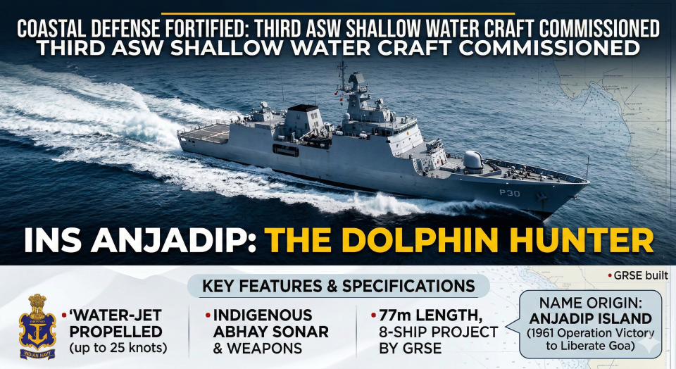 Overview: The Indian Navy has commissioned INS Anjadip, the third next-generation Anti-Submarine Warfare Shallow Water Craft (ASW-SWC). Built indigenously by GRSE, Kolkata, this water-jet-propelled warship significantly enhances India’s underwater threat detection capabilities in littoral waters, boosting the nation’s coastal security architecture.