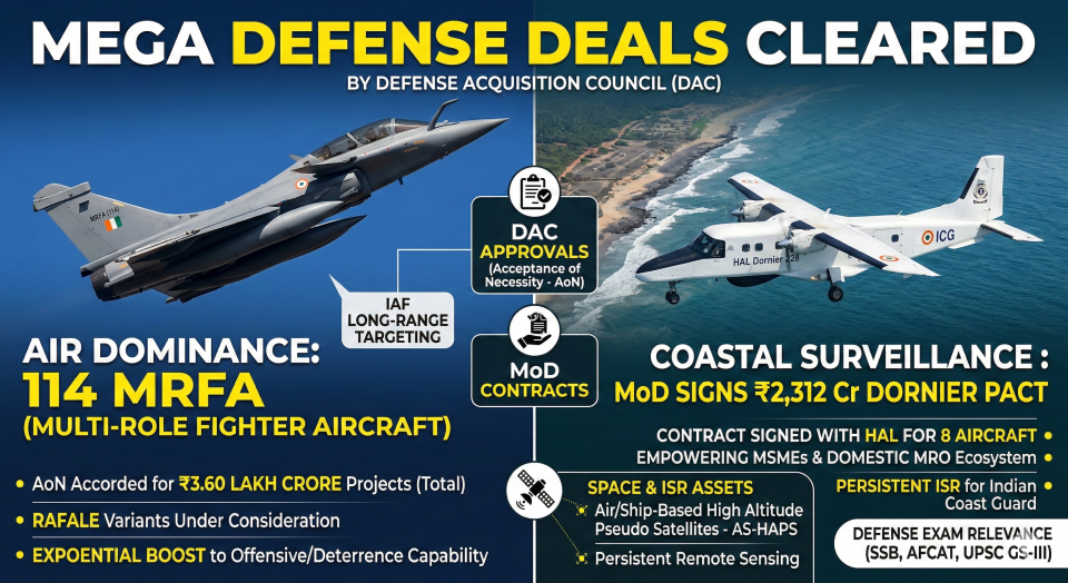 - Overview: The Defense Acquisition Council (DAC) accorded Acceptance of Necessity (AoN) for projects worth ₹3.60 lakh crore, highlighted by the critical 114 Multi-Role Fighter Aircraft (MRFA) procurement for the IAF.