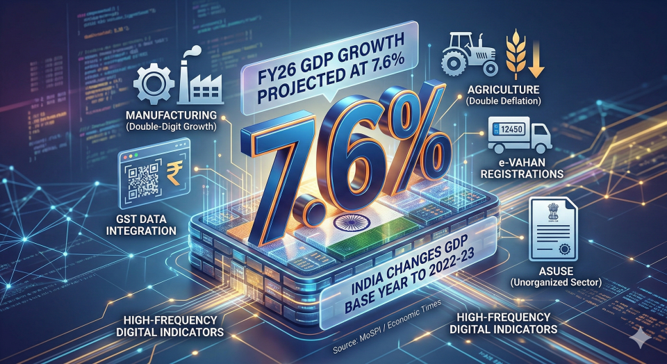 - Overview: The Ministry of Statistics and Programme Implementation (MoSPI) revolutionized India’s GDP calculation by updating the base year from 2011-12 to 2022-23, pushing the FY26 growth projection to a robust 7.6%.