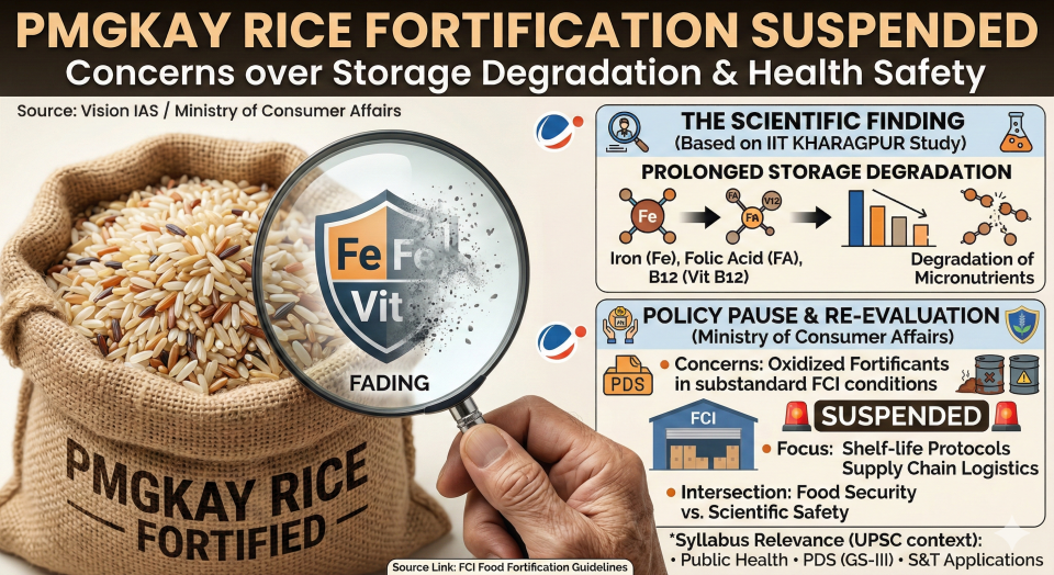 - Overview: The Union government has temporarily suspended the distribution of fortified rice under the Pradhan Mantri Garib Kalyan Anna Yojana (PMGKAY) following a critical study by IIT Kharagpur.