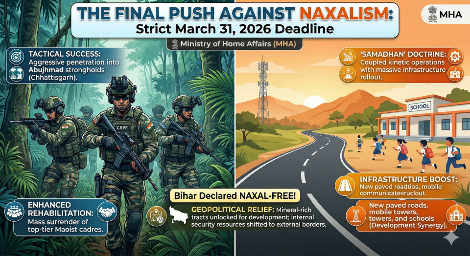 - Overview: The Union Government has established an uncompromising deadline of March 31, 2026, for the complete eradication of Left-Wing Extremism (LWE) across India, following the monumental declaration of Bihar as a Naxal-free state.