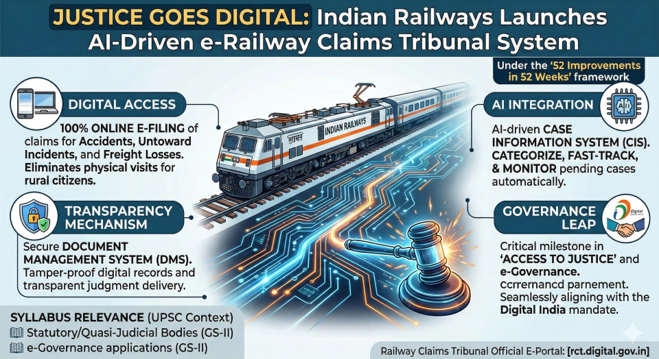 - Overview: Under the ambitious “52 Improvements in 52 Weeks” framework, Indian Railways has launched the fully digital ‘e-Railway Claims Tribunal System’ to ensure speedy and transparent adjudication of public claims.