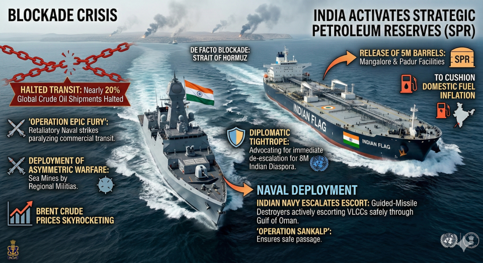 - Overview: The geopolitical crisis in the Middle East has severely deepened as retaliatory naval strikes stemming from ‘Operation Epic Fury’ effectively paralyzed commercial transit through the Strait of Hormuz, prompting India to tap its Strategic Petroleum Reserves (SPR).