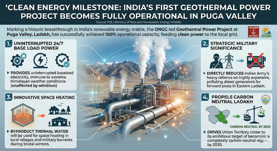 - Overview: Marking a historic breakthrough in India’s renewable energy matrix, the ONGC-led Geothermal Power Project at Puga Valley, Ladakh, has successfully achieved 100% operational capacity, feeding clean power to the local grid.