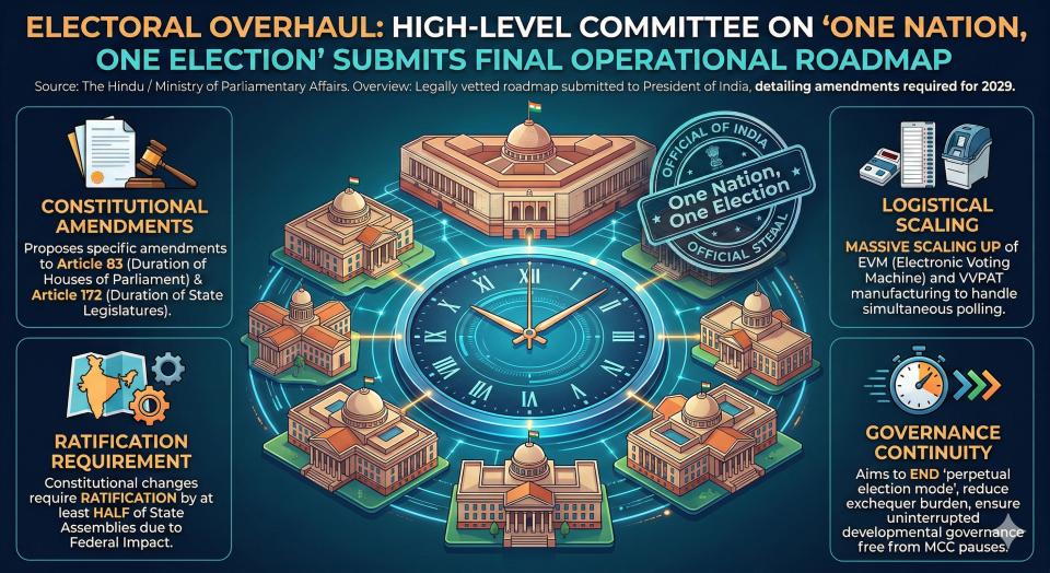 - Overview: The High-Level Committee on Simultaneous Elections has officially submitted its final, legally vetted roadmap to the President of India, detailing the constitutional amendments required to implement ‘One Nation, One Election’ by 2029.