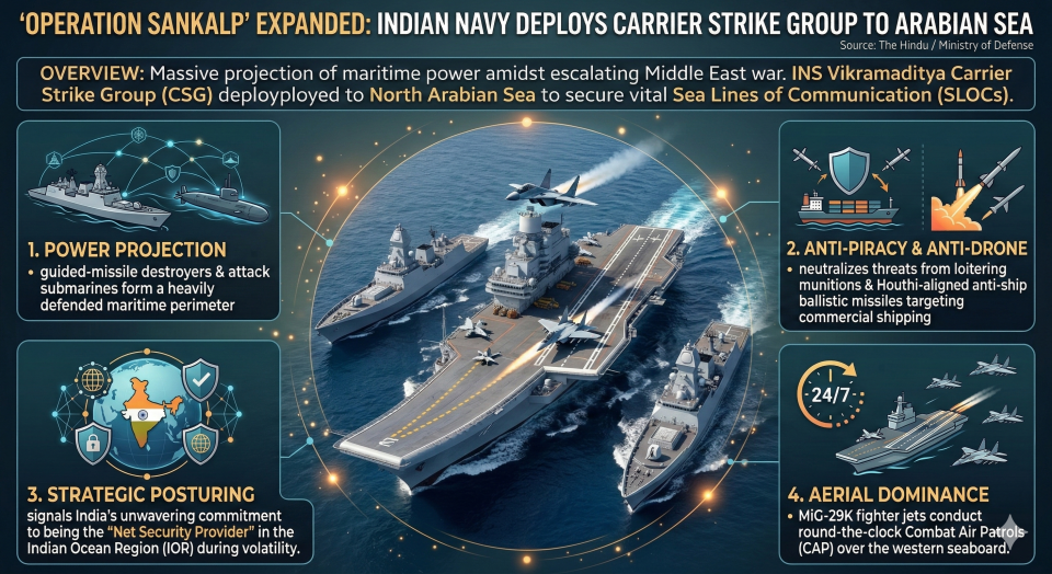- Overview: In a massive projection of maritime power amidst the escalating Middle East war, the Indian Navy has deployed the INS Vikramaditya Carrier Strike Group (CSG) to the North Arabian Sea to secure vital Sea Lines of Communication (SLOCs).