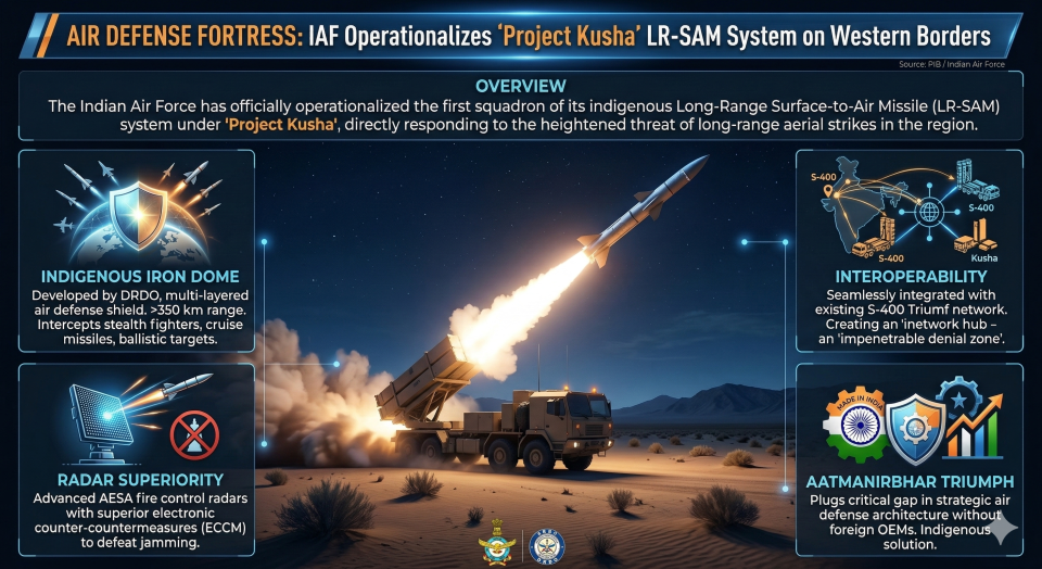 - Overview: The Indian Air Force has officially operationalized the first squadron of its indigenous Long-Range Surface-to-Air Missile (LR-SAM) system under ‘Project Kusha’, directly responding to the heightened threat of long-range aerial strikes in the region.