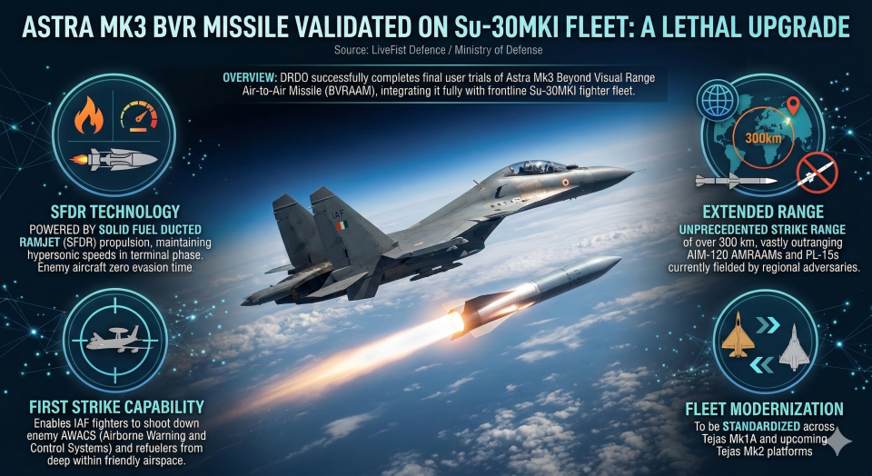 - Overview: In a lethal upgrade to the IAF’s aerial combat edge, the DRDO successfully completed the final user trials of the Astra Mk3 Beyond Visual Range Air-to-Air Missile (BVRAAM), integrating it fully with the frontline Su-30MKI fighter fleet.