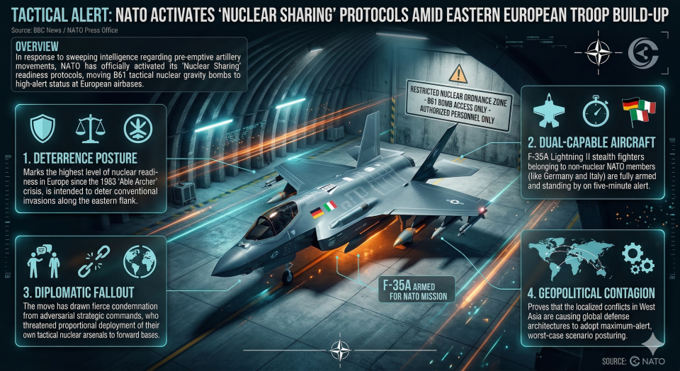 - Overview: In response to sweeping intelligence regarding pre-emptive artillery movements, NATO has officially activated its ‘Nuclear Sharing’ readiness protocols, moving B61 tactical nuclear gravity bombs to high-alert status at European airbases.