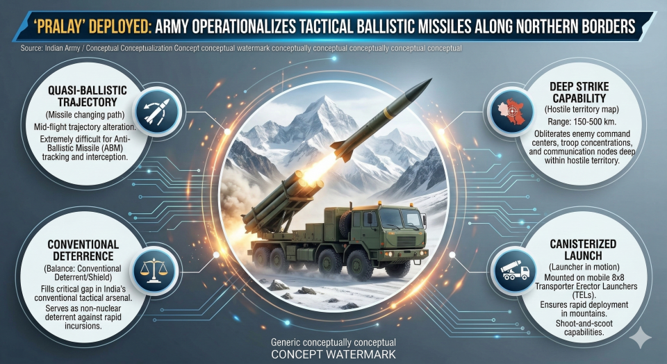 - Overview: In a swift offensive posturing move, the Indian Army’s Strategic Forces Command has operationalized the first regiment of ‘Pralay’ tactical quasi-ballistic missiles along critical sectors of the Line of Actual Control (LAC).