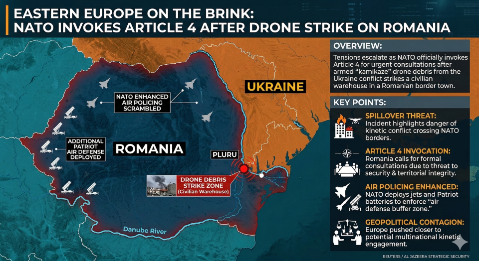 - Overview: Tensions in Eastern Europe reached a boiling point as NATO officially invoked Article 4 for urgent consultations after armed “kamikaze” drone debris from the ongoing conflict struck a civilian warehouse in a Romanian border town.