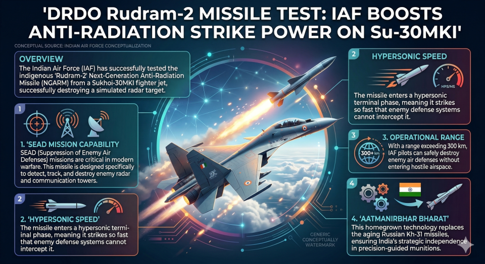 - Overview: The Indian Air Force (IAF) has successfully tested the indigenous ‘Rudram-2’ Next-Generation Anti-Radiation Missile (NGARM) from a Sukhoi-30MKI fighter jet, successfully destroying a simulated radar target.