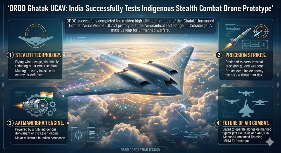- Overview: In a massive leap for unmanned warfare, the Defense Research and Development Organisation (DRDO) successfully completed the maiden high-altitude flight test of the ‘Ghatak’ Unmanned Combat Aerial Vehicle (UCAV) prototype at the Aeronautical Test Range in Chitradurga.