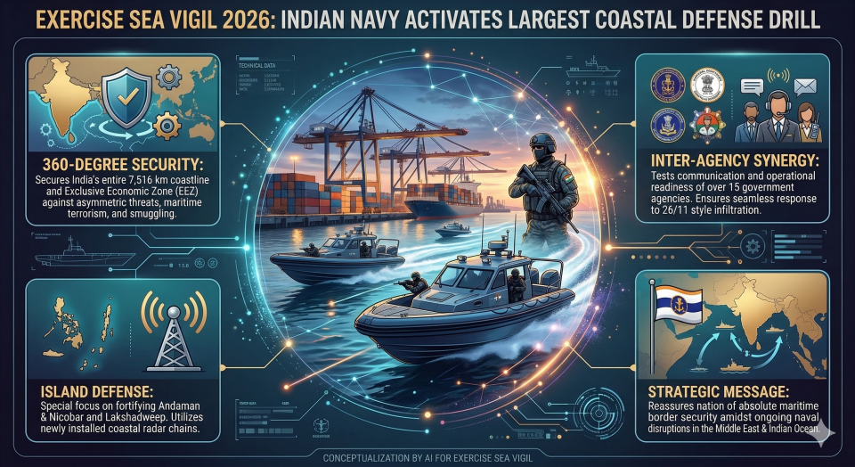 - Overview: The Indian Navy, in coordination with the Coast Guard and marine police of all 13 coastal states and Union Territories, has launched ‘Exercise Sea Vigil 2026’, the nation’s largest coastal defense exercise.