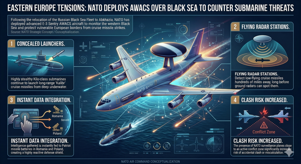 - Overview: Following the relocation of the Russian Black Sea Fleet to Abkhazia, NATO has deployed a fleet of advanced E-3 Sentry AWACS aircraft to monitor the western Black Sea and protect vulnerable European borders from cruise missile strikes.