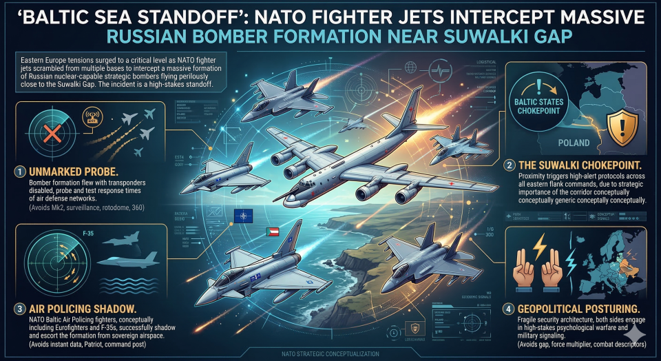 - Overview: Tensions in Eastern Europe surged to a critical level as NATO fighter jets scrambled from multiple bases to intercept a massive formation of Russian nuclear-capable strategic bombers flying perilously close to the Suwalki Gap.