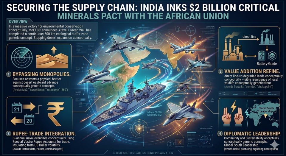 - Overview: Outmaneuvering geopolitical rivals in the race for future resources, India has signed a historic, $2 Billion critical minerals acquisition and processing pact with the African Union (AU) at the New Delhi Summit.